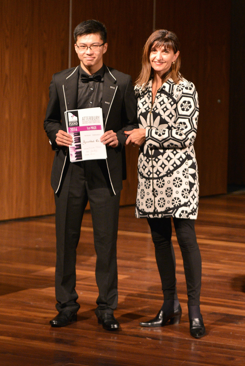 Overall winner of the Piano competition 2016, Swunhtat Oo and Zahn Hulme Executive trustee from the Atterbury Trust.